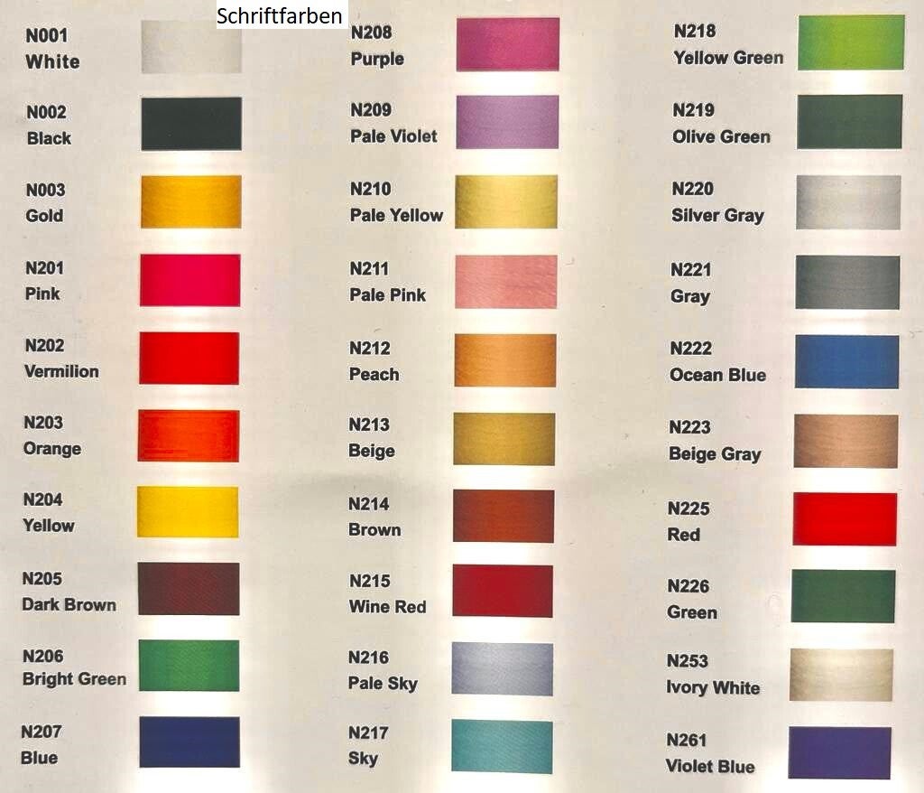 Bitte gib hier deinen Wunschtext, sowie Schriftart und Schriftfarbe ein.